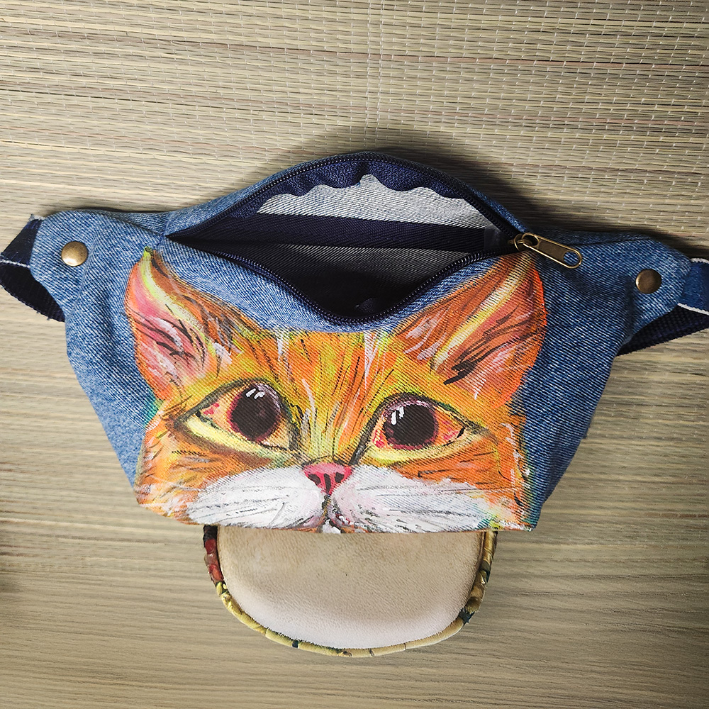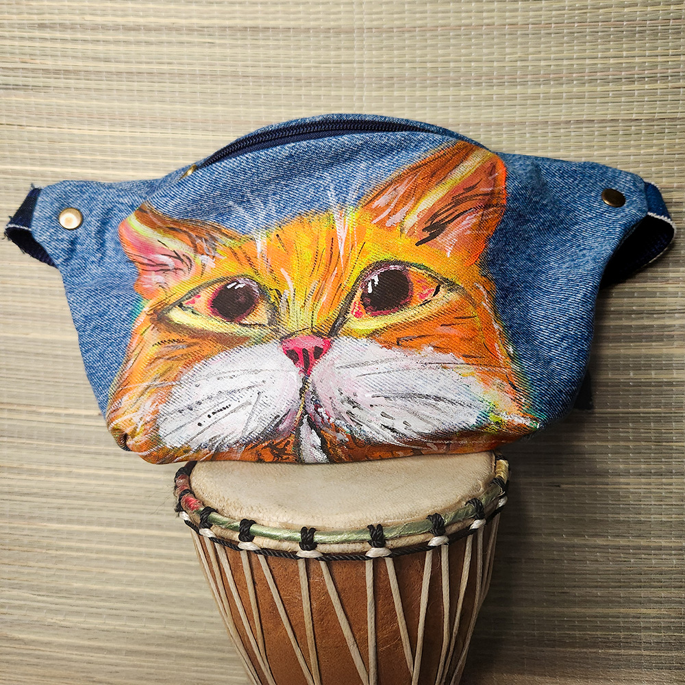Exklusive Bauchtasche aus recyceltem Denim – vereint Stil und Umweltbewusstsein in einem Produkt. Jedes Stück ist ein Unikat: Das Motiv wird von Hand gemalt und existiert nur ein einziges Mal.