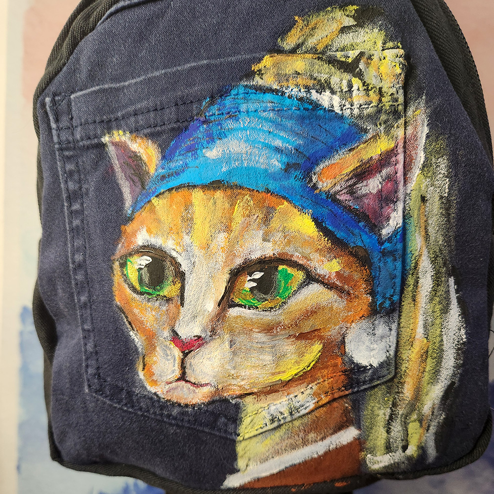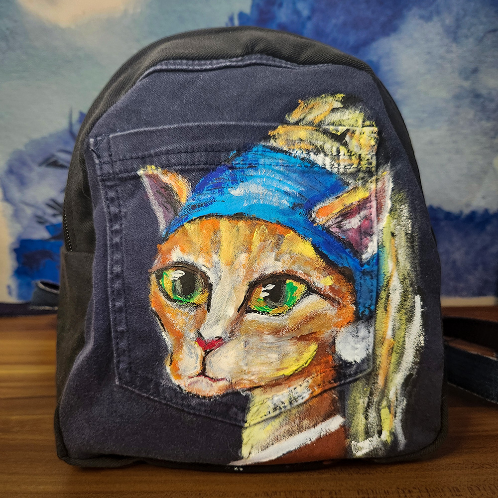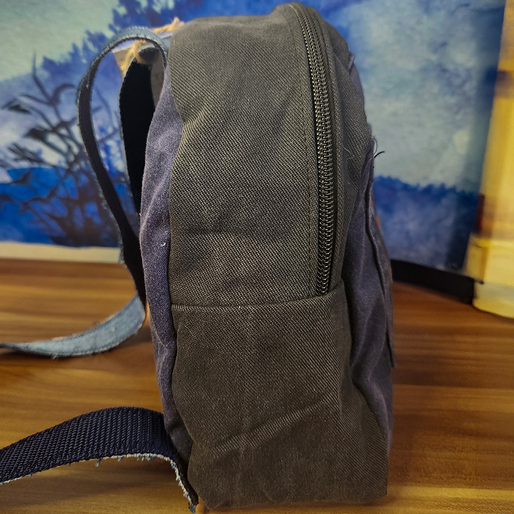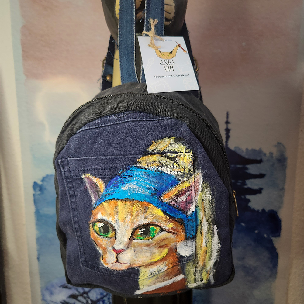 Ein exklusiver Rucksack aus recyceltem Jeansstoff – vereint Stil und Umweltbewusstsein in einem Produkt. Jedes Stück ist ein Unikat: Das Motiv wird von Hand gemalt und existiert nur ein einziges Mal.