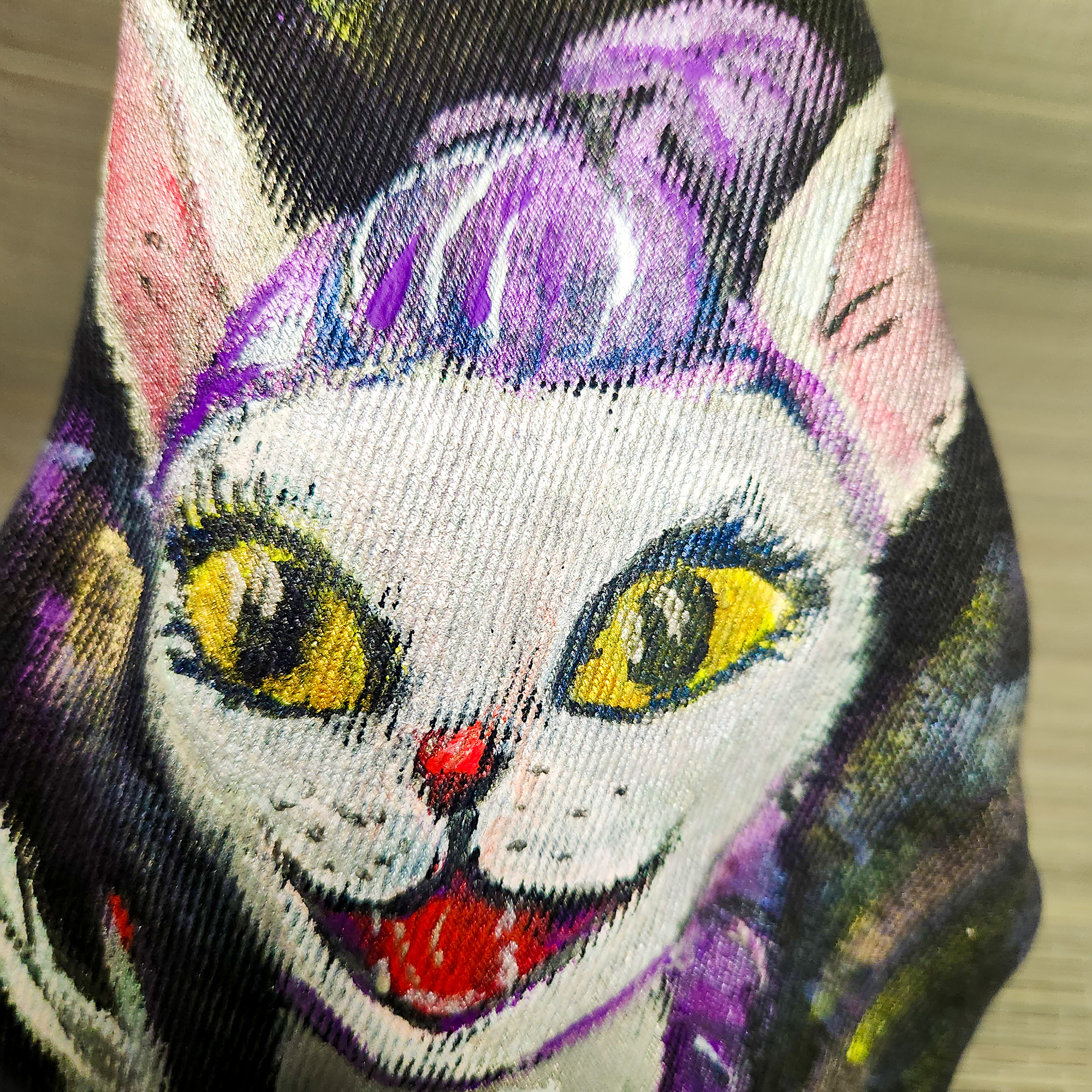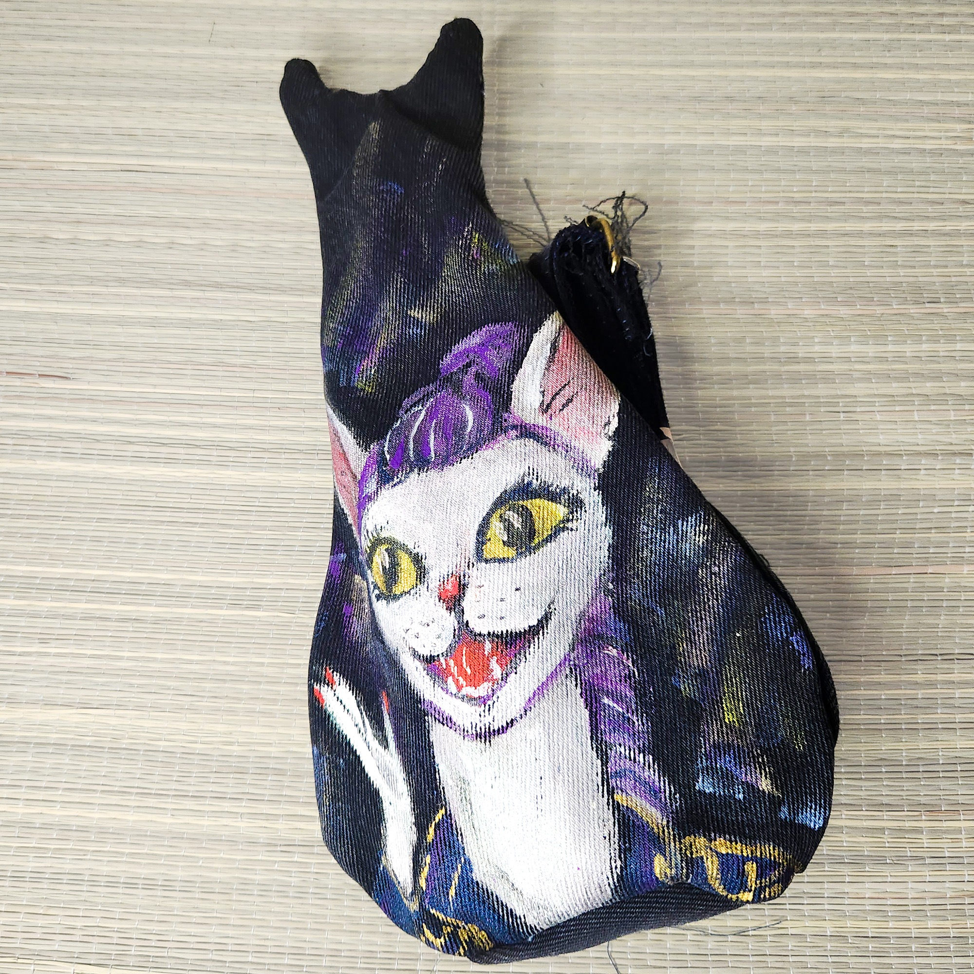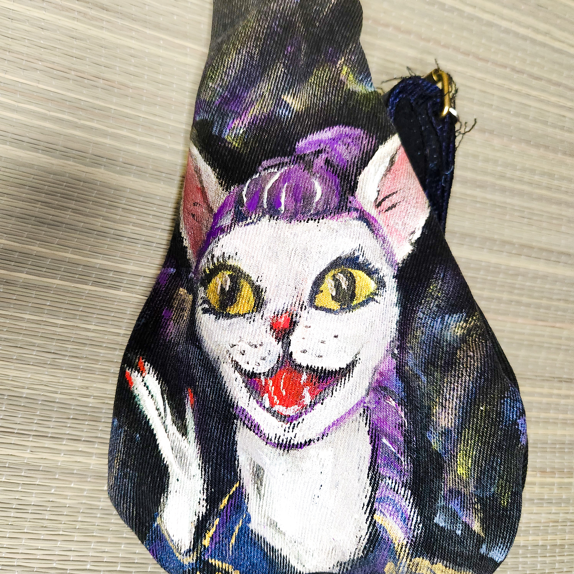 Eine exklusive Tasche in Form einer niedlichen Katze aus recyceltem Jeansstoff – vereint Stil und Umweltbewusstsein in einem einzigartigen Accessoire. Jedes Stück ist ein Unikat: Das Motiv wird von Hand gemalt und existiert nur ein einziges Mal.
