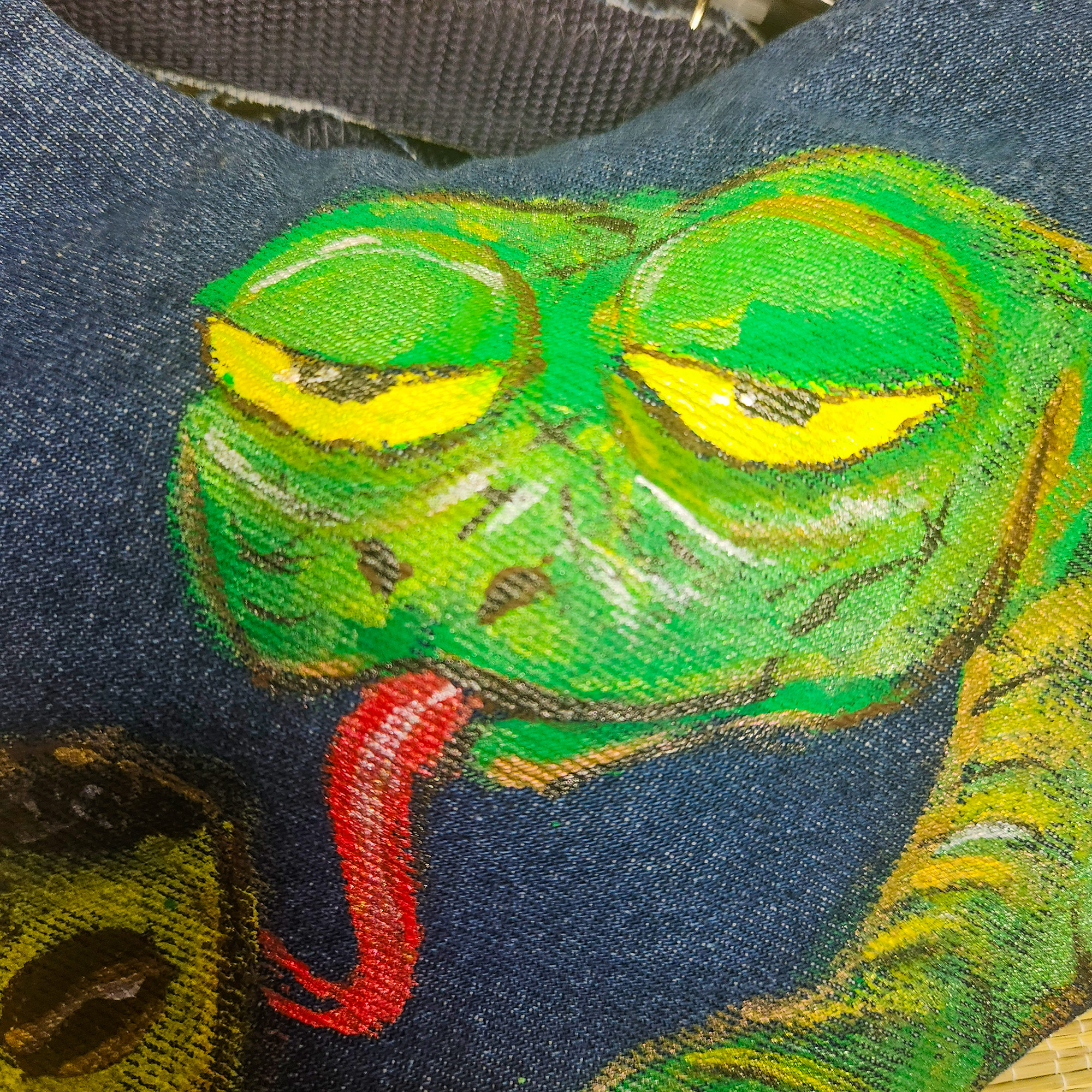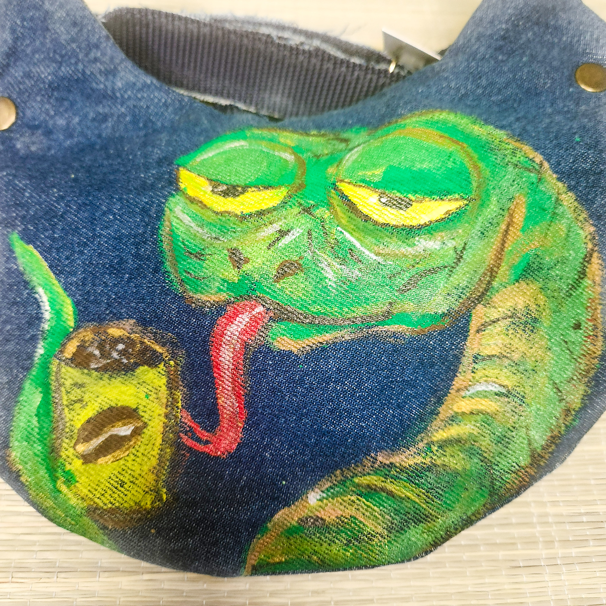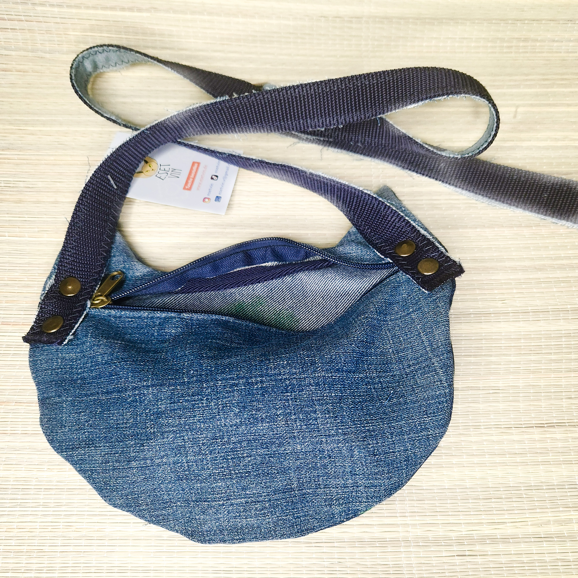 Eine exklusive Tasche in Form einer niedlichen Katze aus recyceltem Jeansstoff – vereint Stil und Umweltbewusstsein in einem einzigartigen Accessoire. Jedes Stück ist ein Unikat: Das Motiv wird von Hand gemalt und existiert nur ein einziges Mal.