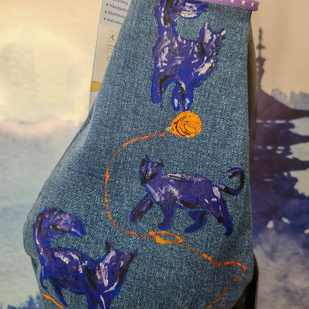 Eine exklusive Tasche in Form einer niedlichen Katze aus recyceltem Jeansstoff – vereint Stil und Umweltbewusstsein in einem einzigartigen Accessoire. Jedes Stück ist ein Unikat: Das Motiv wird von Hand gemalt und existiert nur ein einziges Mal.